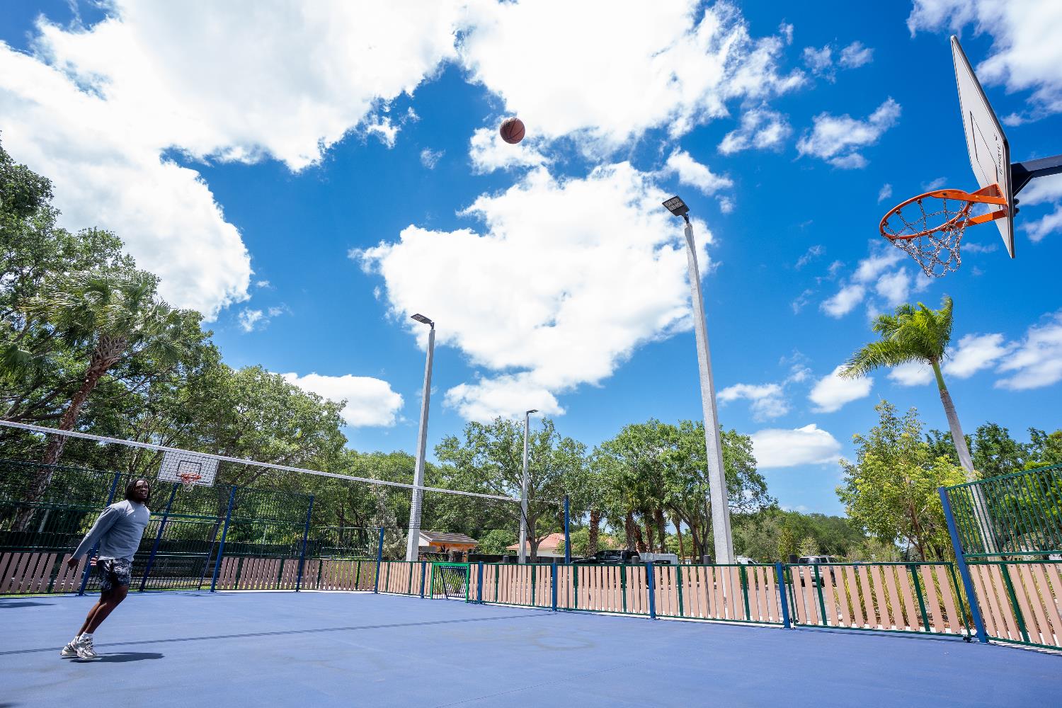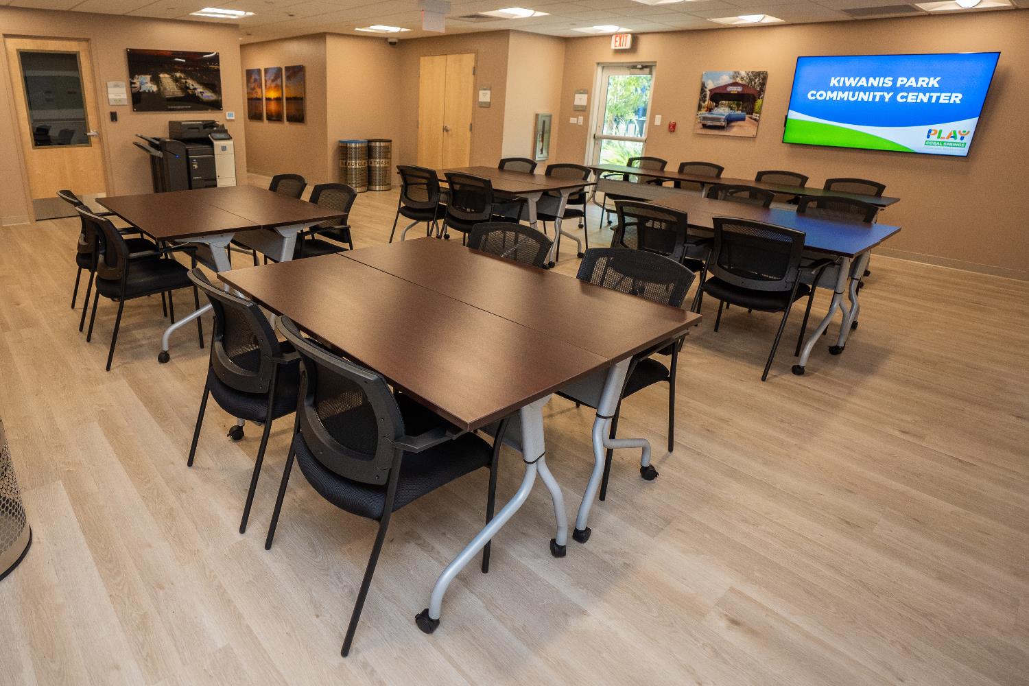 The Kiwanis Park Community Center is a multi-purpose hub that brings residents together for recreation, learning, and social connection – all within the larger Kiwanis Park. The facility features a comfortable lounge area with seating and televisions for socialization, along with a full kitchen to support cooking classes and demonstrations. A flexible gathering room accommodates meetings, classes, and programs for all ages, while a staffed front desk provides convenient access for registrations and assistance. The center also includes a large indoor recreation space with a wood floor for activities such as pickleball and basketball, complemented by an outdoor patio for participant use. Expanding opportunities for active play, the site is further enhanced by a KOMPAN multi-use sports court, generously donated by the Florida Panthers Foundation.